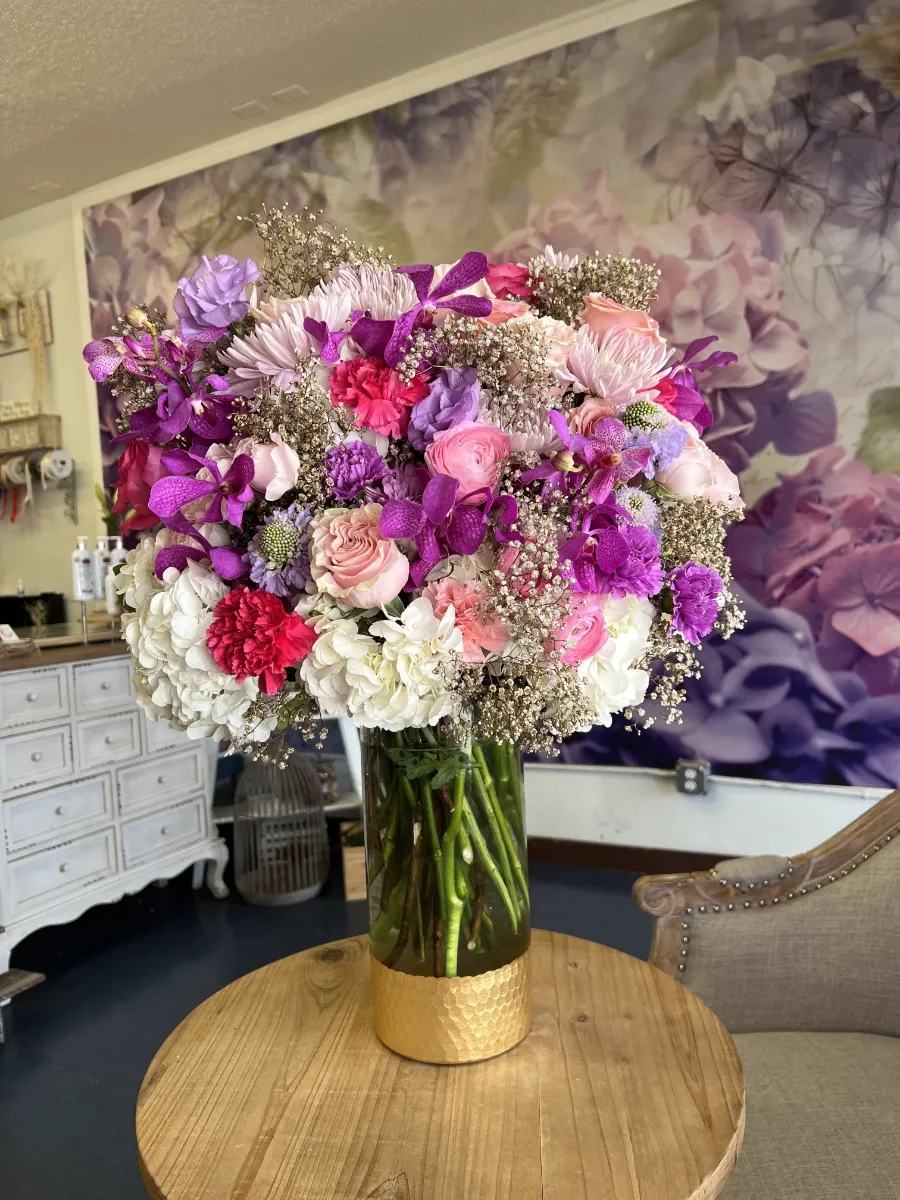 All around arrangement including hydrangea, orchids, roses, carnations, moms, gyp and ets. Apros. size 24×21 inches